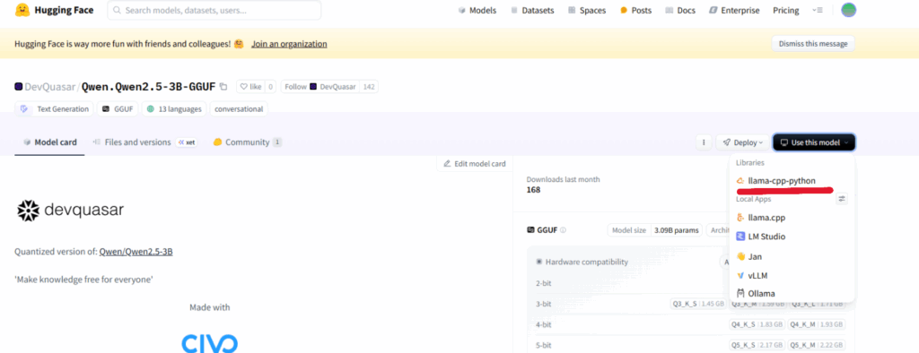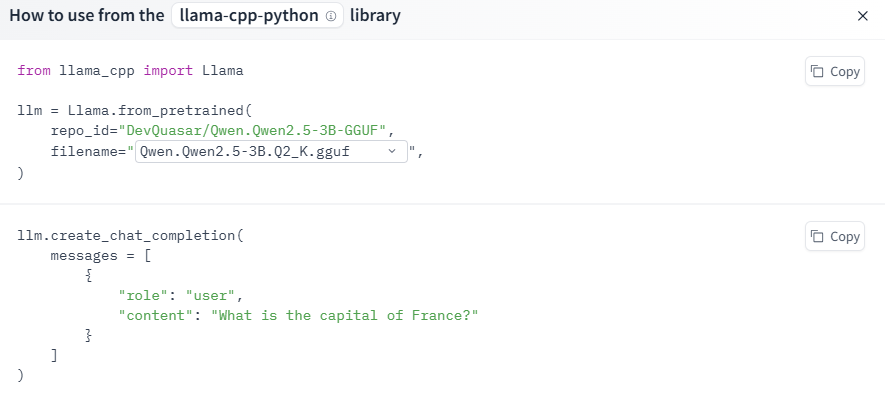 ◯右のあたりにあるUseThisModelをクリックするとどの環境で使用するかが選べるので、例えばPythonにインポートして使用する場合はllama-cpp-python をクリックする