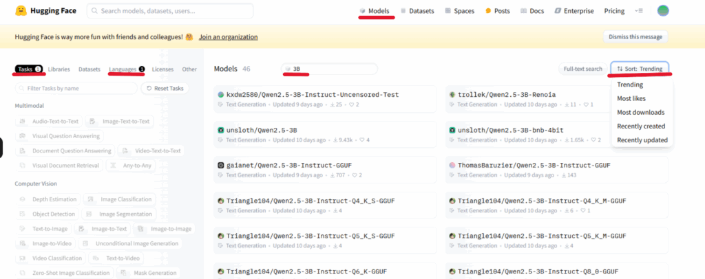 ◯Tasksをクリックするとどんな用途(例えばTextToImageとか)を選べるので目的にあったものをクリック